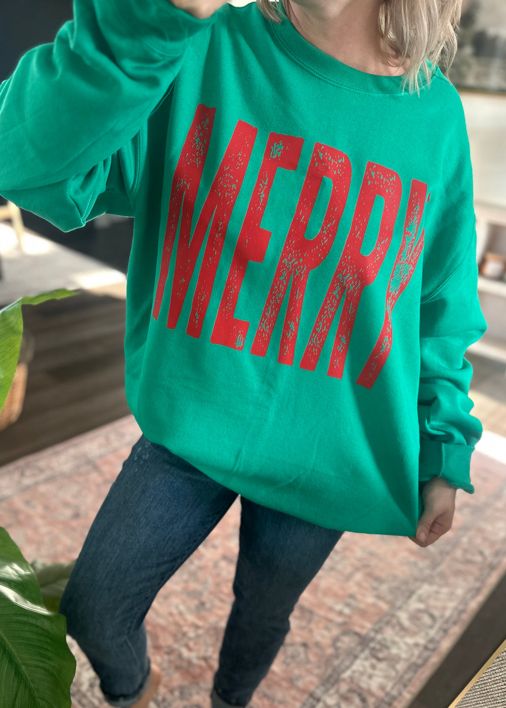 DISTRESSED MERRY TEE OR SWEATSHIRT