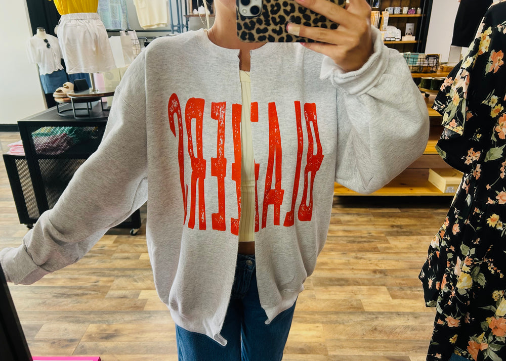 SPLIT CARDI CREW SCHOOL YOUTH OR ADULT PULLOVER - CUT and DISTRESSED DOWN THE CENTER - EACH TOP IS MADE TO ORDER. SIZE UP ATLEAST ONE FOR A LOOSE, OVERSIZED FIT.