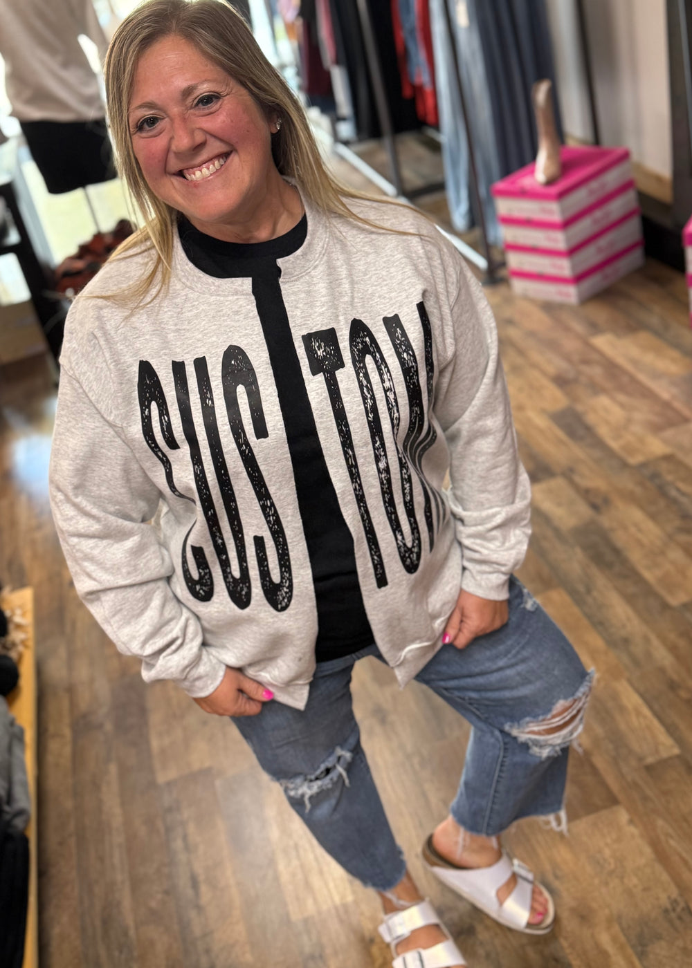 SPLIT CARDI CREW SCHOOL YOUTH OR ADULT PULLOVER - CUT and DISTRESSED DOWN THE CENTER LEAVING A RAW HEM - EACH TOP IS MADE TO ORDER. SIZE UP ATLEAST ONE FOR A LOOSE, OVERSIZED FIT. SEE SIZE CHART.