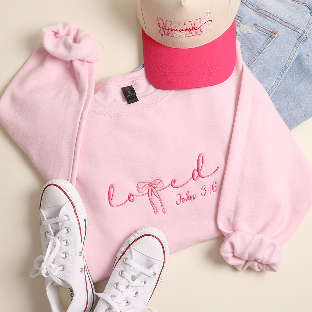 Feel the love in every stitch with this adorable soft pink sweatshirt that celebrates faith with flair. Featuring playful "Loved" embroidery accented by a sweet bow and "John 3:16" script, this design brings joy and inspiration to your cozy rotation.