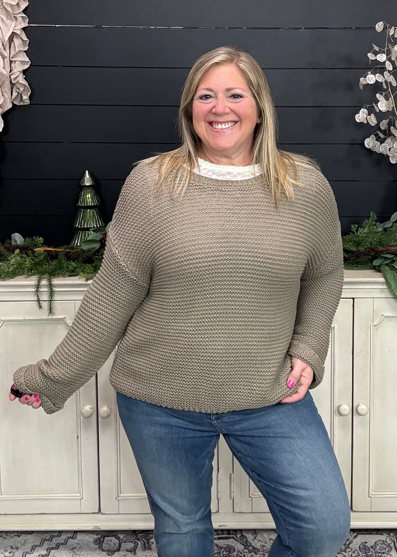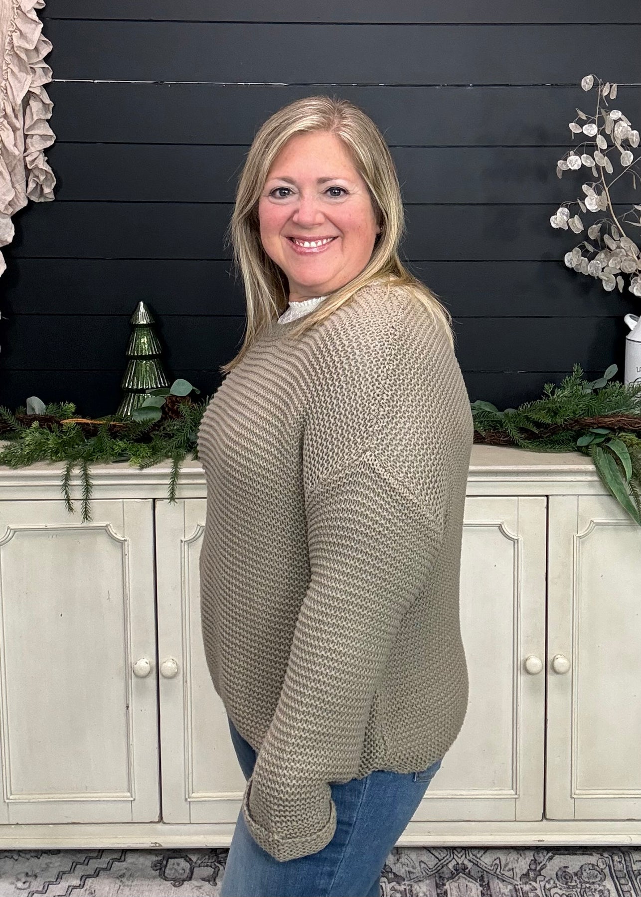 The Olive Grove Knit Top combines the cozy feel of a sweatshirt with the style of a sweater, featuring long cuffed sleeves and a relaxed drop shoulder design. Its versatile fit—both tailored and comfortably slouchy—makes it easy to dress up with slacks or keep casual with denim. The rich olive hue complements a wide range of wardrobe choices, making it ideal for transitioning from the office to social outings. Pair it with boots or wedges along with your preferred Jen & Co bag and signature jewelry for a polished, effortless look.