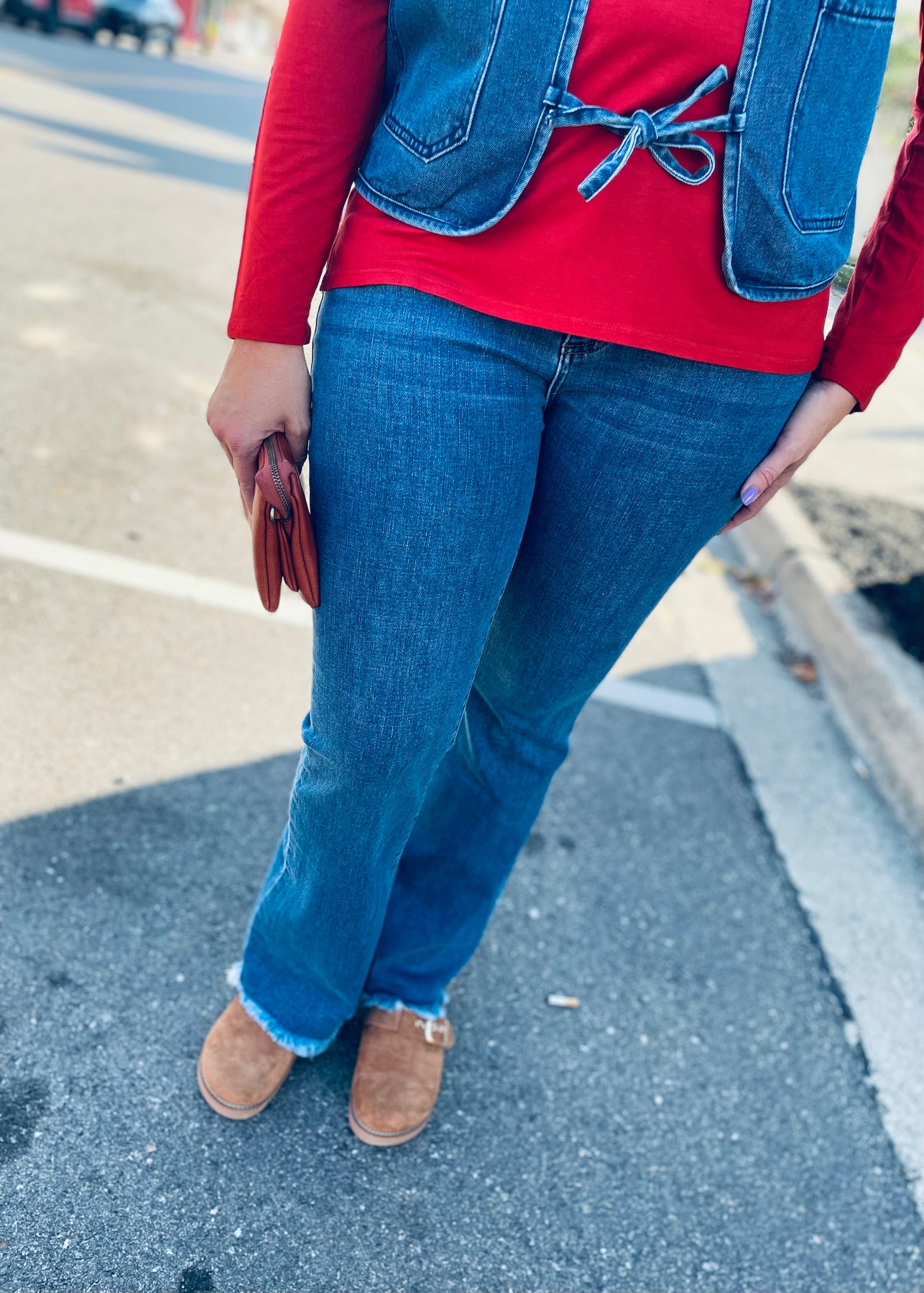 These high-rise Judy Blue bootcut jeans offer a modern update to a classic style, featuring a flattering fit that accentuates the waist with a double-button waistband. Finished in a versatile medium blue wash, they contour the hips and thighs and flare subtly to elongate the legs. The frayed hem detail adds a relaxed yet refined touch, making them ideal for versatile styling from casual outings to more polished looks.