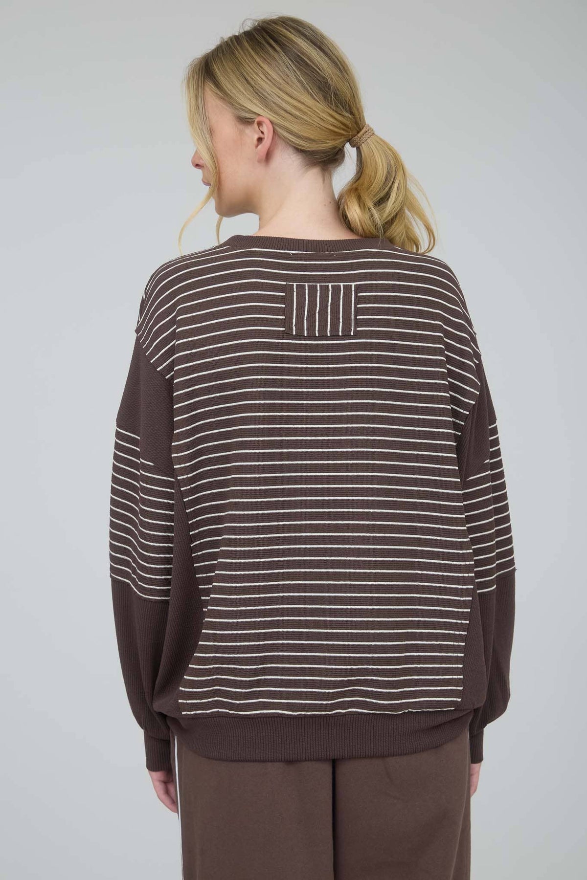 This chocolate stripe long sleeve top features a round neckline, long sleeves and drop shoulder design for a trendy look. The patchwork contrast detail adds a touch of uniqueness, while the stripe pattern and knit material provide comfort and style. It is not lined, making it perfect for layering.