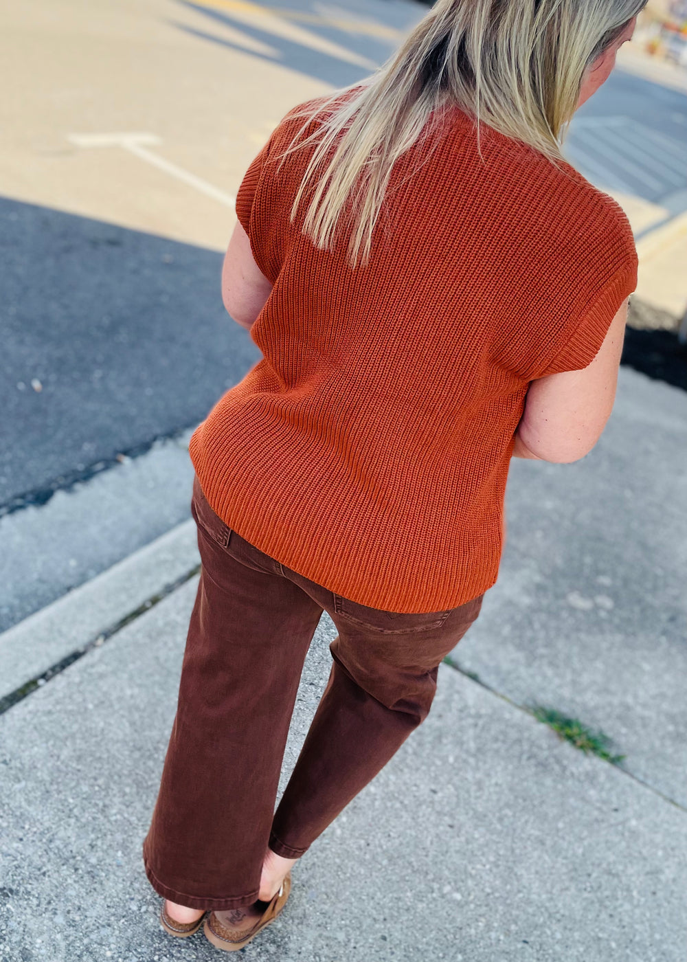 Round Neck Drop Shoulder Ribbed Sweater Vest - Sleek ribbed knit sweater vest in two versatile colorways: heather grey and rust brown - Classic round neckline with clean finished edges - Contemporary drop shoulder design with wide armholes for a relaxed silhouette - Chunky ribbed texture throughout provides visual interest and warmth STYLE MEASUREMENTS (SIZE SMALL) - TOTAL LENGTH 24" - BUST 21" - SHOULDER 20" 50%ACRYLIC 50%COTTON