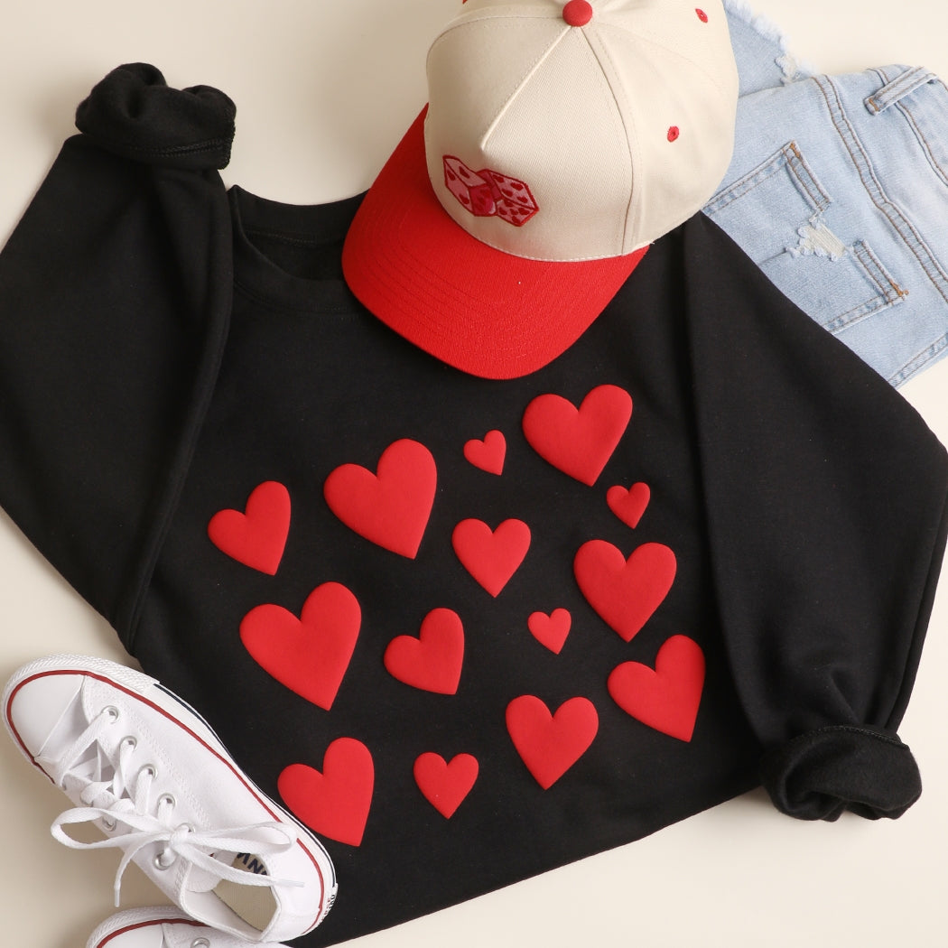 Wear your heart on your sleeve—literally—with this fun heavyweight crewneck showcasing a scattered pattern of textured puffy hearts in varying sizes. The dimensional design brings instant charm and a flirty romantic vibe to your casual wardrobe.