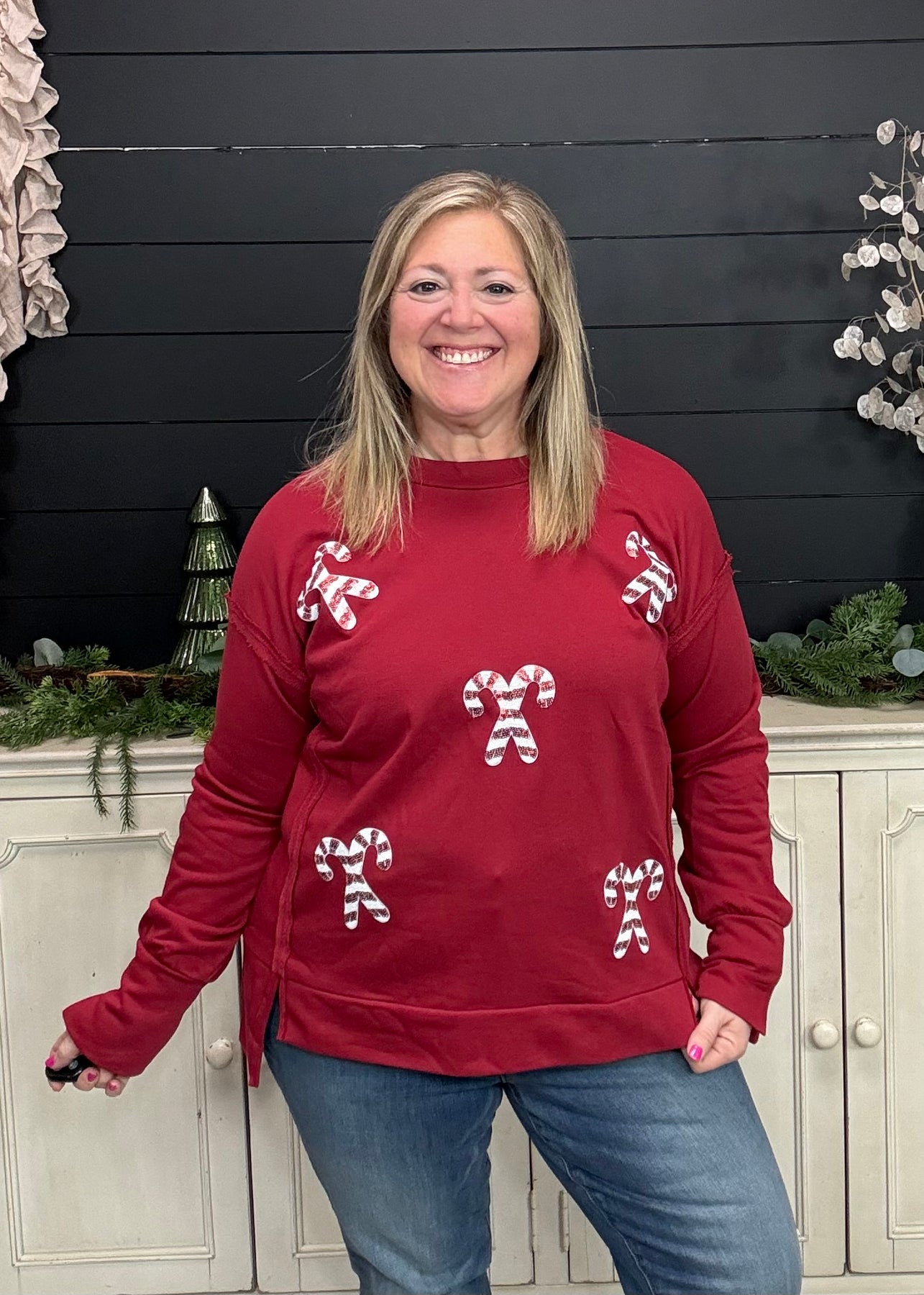This Peppermint Sparkle Sequin Candy Cane shirt is crafted from soft French Terry fabric and showcases a rounded neckline with long sleeves ending in elegant slit cuffs. Embellished with shimmering sequin candy cane designs, it adds a festive, eye-catching flair. Perfect for holiday celebrations, it pairs effortlessly with Judy Blue Denim and Corky's footwear for a stylish seasonal look.