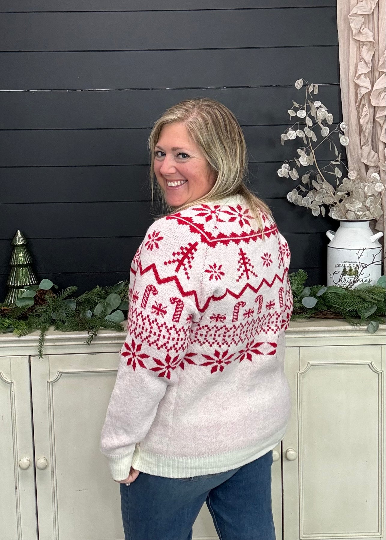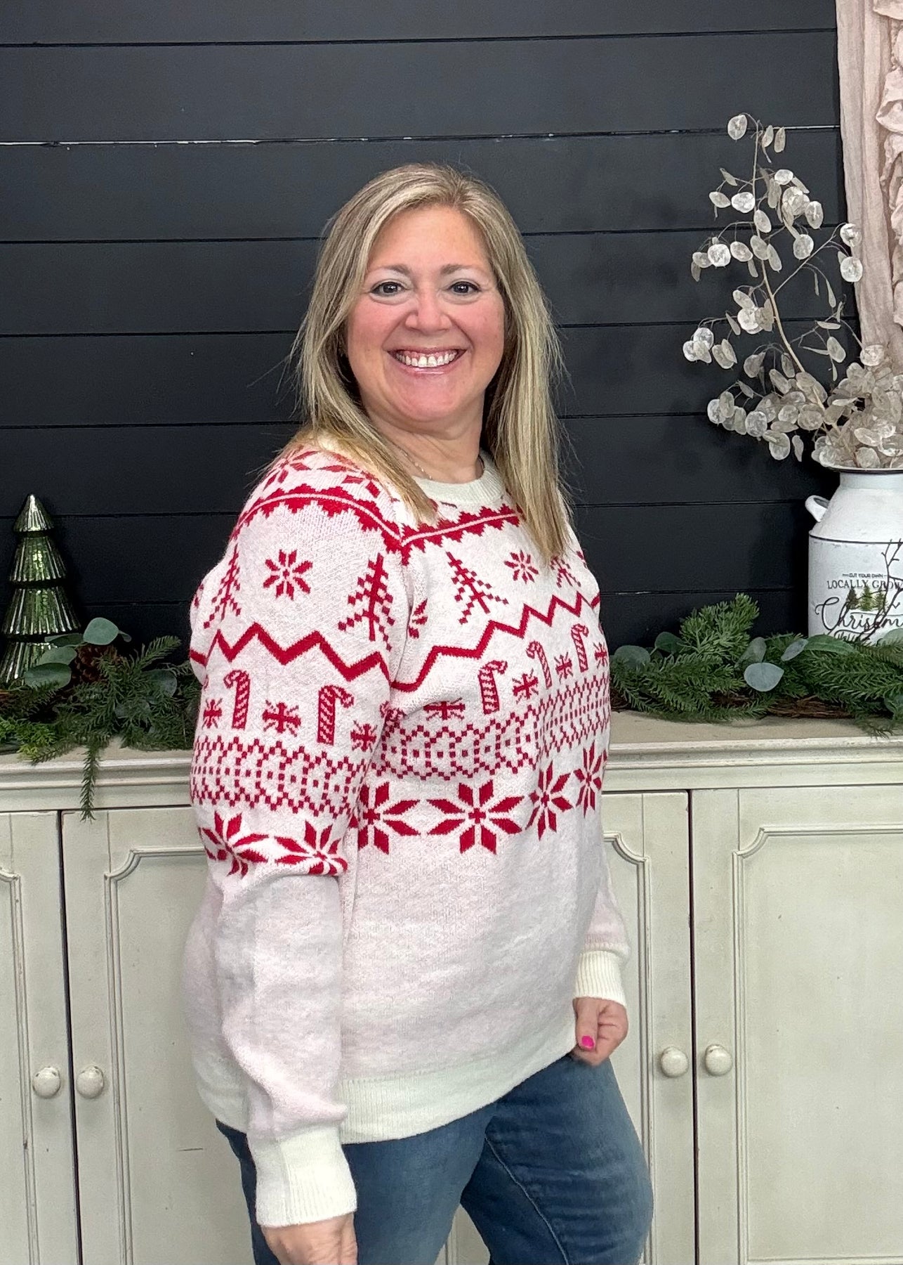 Celebrate the season with the Merry Moments Christmas Raglan Sleeve Sweater. This knit sweater showcases a traditional Fair Isle pattern, highlighting iconic holiday motifs like snowflakes, trees, and candy canes in vibrant, festive colors. Designed with raglan sleeves, it offers an easy, comfortable fit ideal for both holiday gatherings and everyday winter wear.