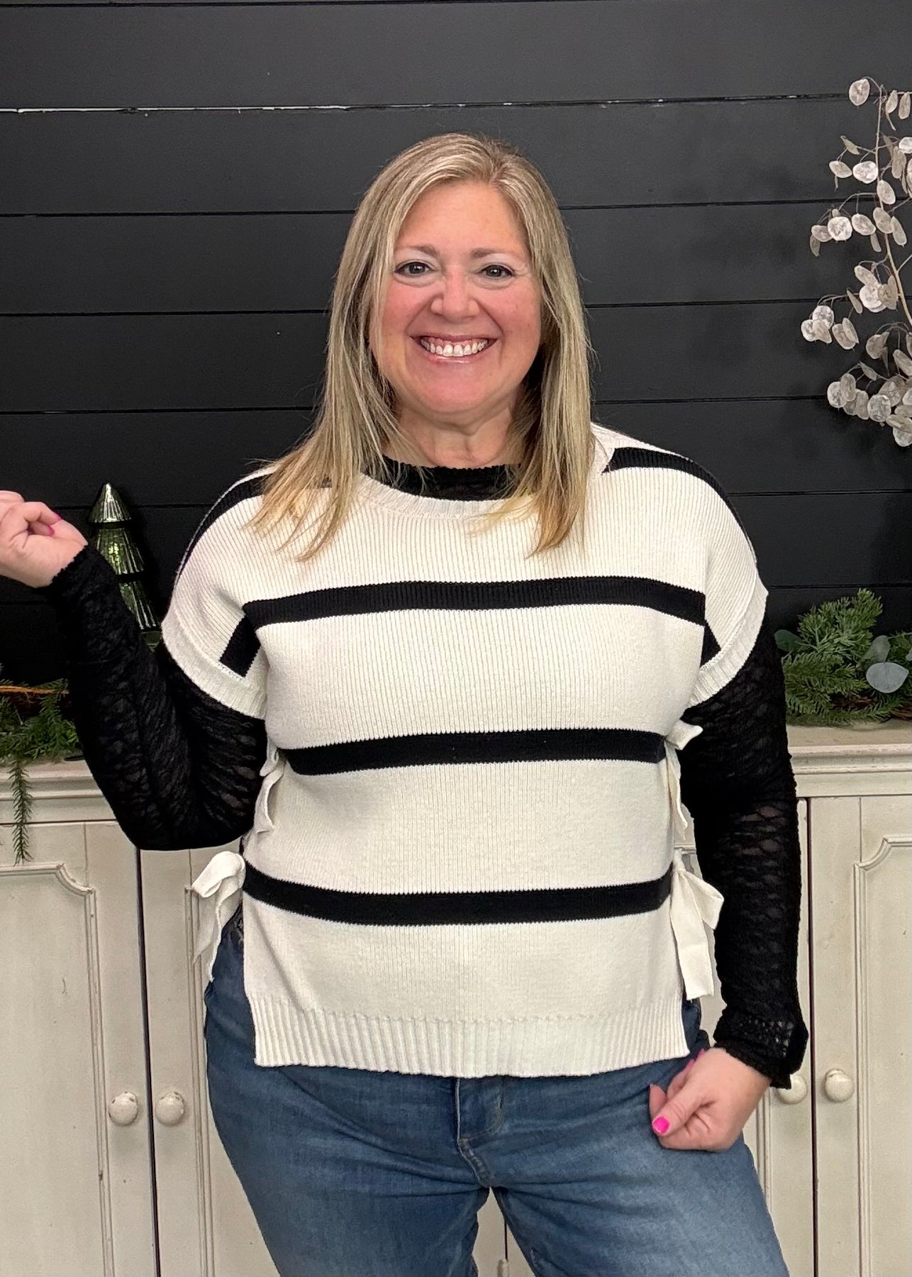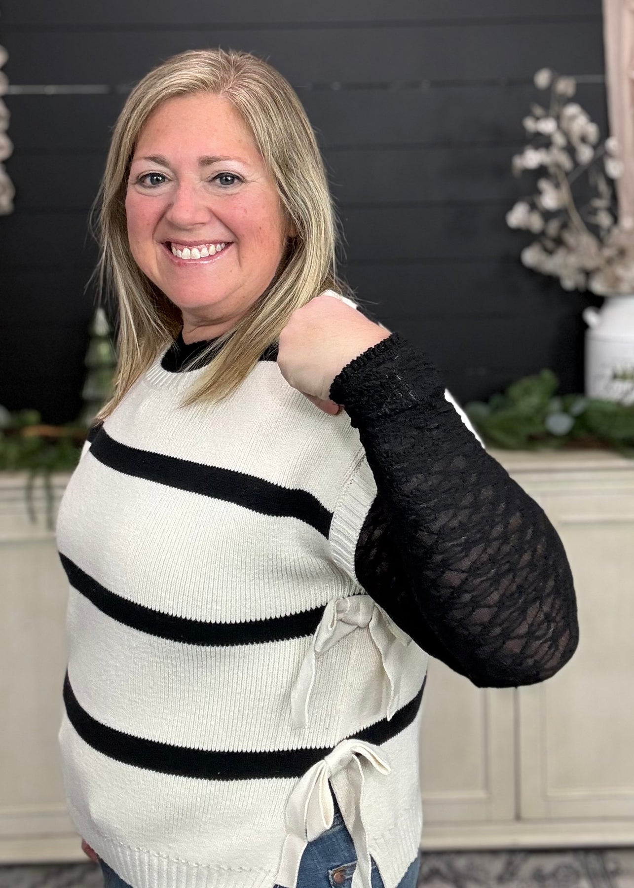 The Creamy Stripes Sweater showcases a round neckline, short sleeves, and a drop shoulder design, complemented by a side tie strap detail. This relaxed-fit, striped knit pullover pairs effortlessly with denim, skirts, or dress pants. For an elevated evening look, layer it over a lace long-sleeve top.