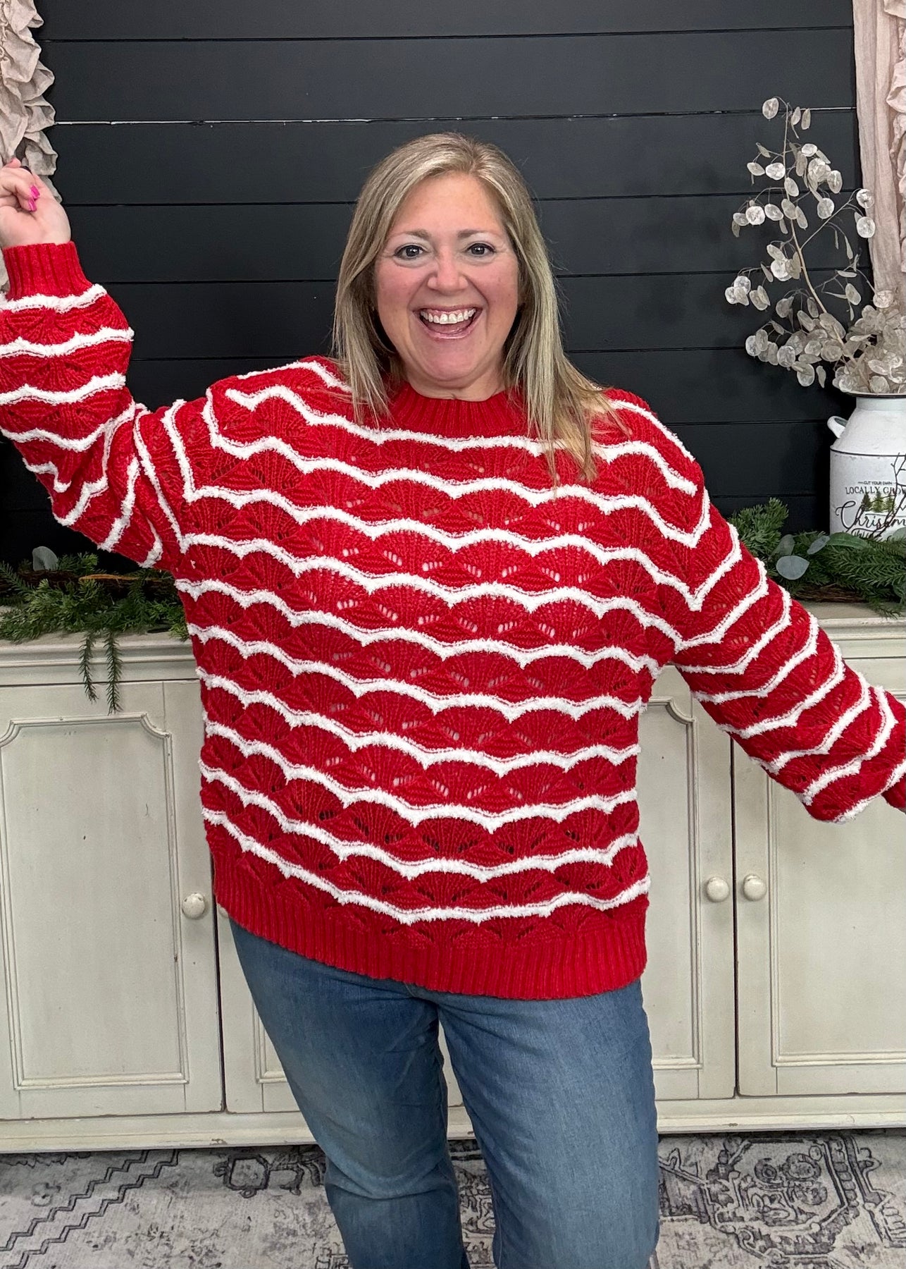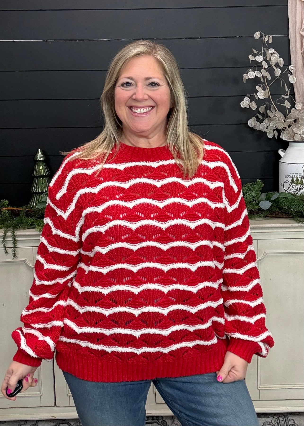 Savor the holiday season in style with our Peppermint Stripes Sweater. Made from high-quality sweater material, this expertly crafted custom sweater is the perfect addition to your festive wardrobe. Pair it with Judy Blue Denim and Corky's footwear for a unique and fashionable look.