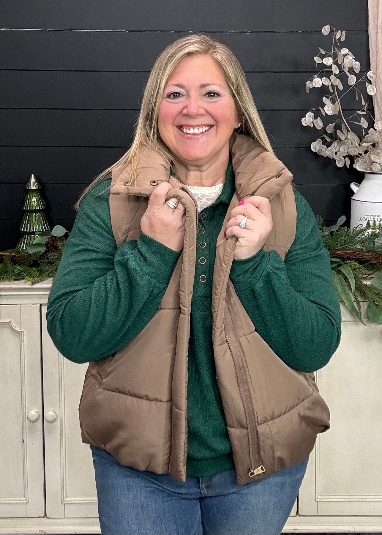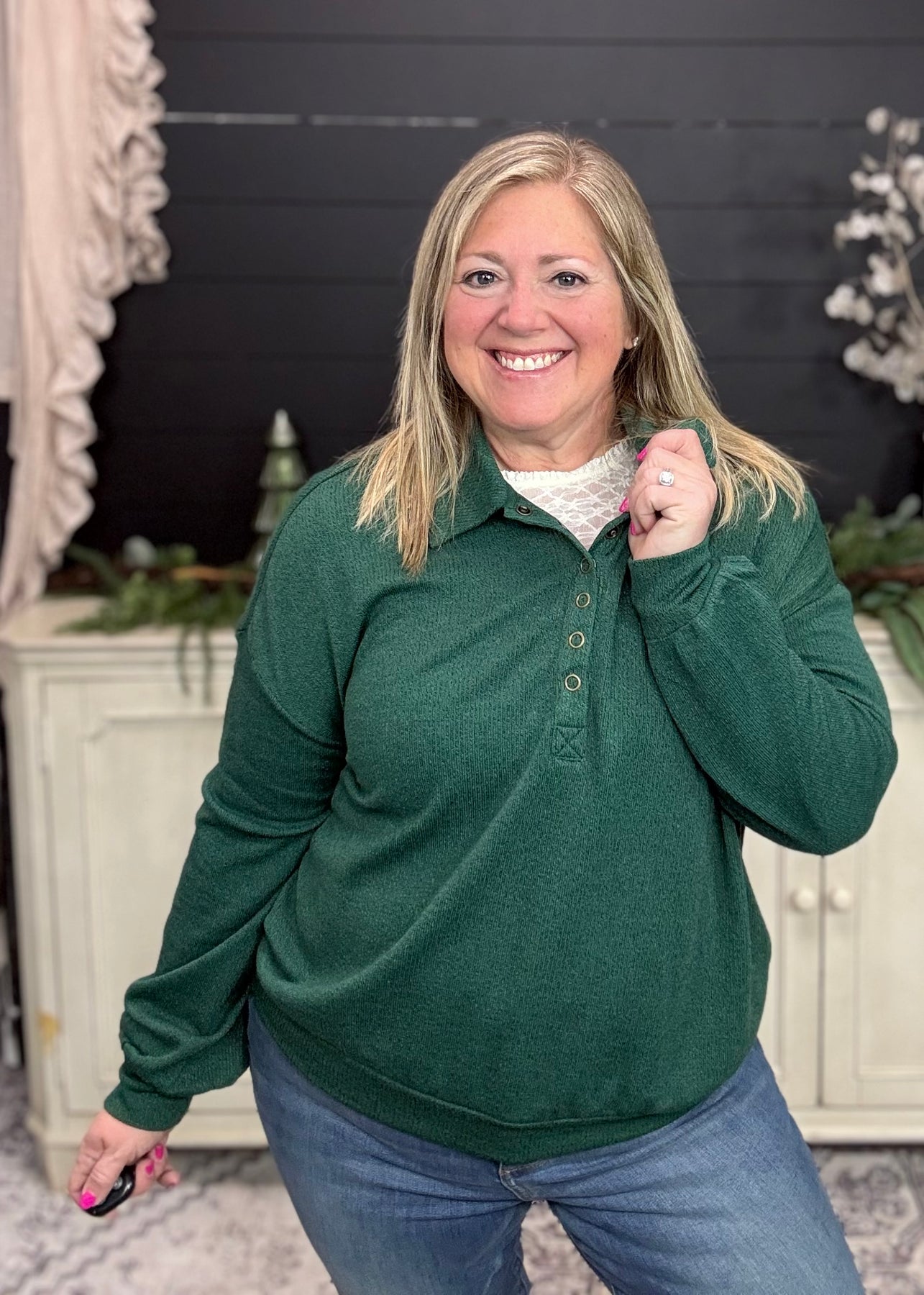 The Evergreen Escape Top showcases a classic collar and half snap-buttoned long sleeves. Its rich Forest Green hue makes it an ideal choice for holiday gatherings, family portraits, and Christmas cards. Versatile in styling, it pairs effortlessly with denim or any pants, and can be dressed up with a skirt. Complete your look with a Jen & Co. handbag and Corky's shoes for a polished, festive ensemble.