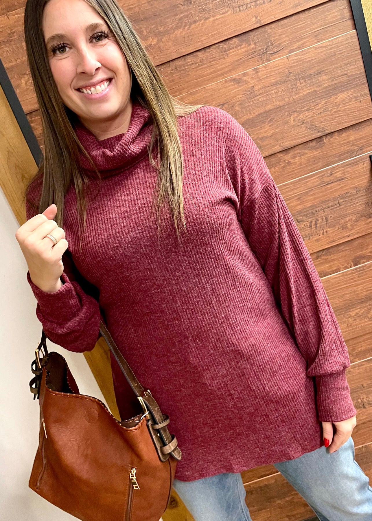 This burgundy turtle neck tunic top boasts a relaxed, flowy neckline, perfect for those who want to stand out. The incredibly soft fabric and side slits offer versatility, whether you choose to tuck it in or wear it untucked with leggings or our Judy Blue Denim.