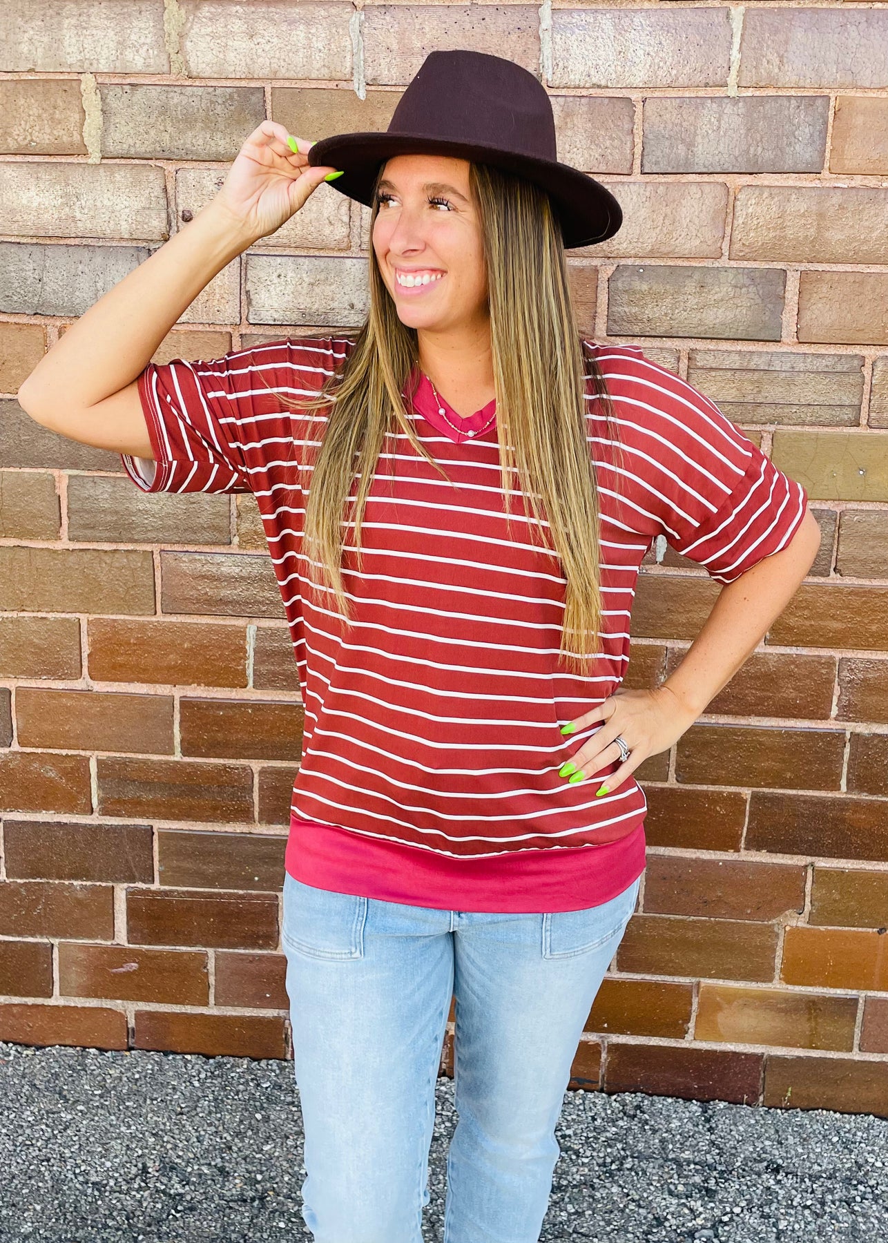 Indulge in the vibrant energy of the Rust Stripe V-Neck Short Sleeve Tunic Top, featuring stunning white stripes! Elevate your style and embrace the power of this must-have garment.