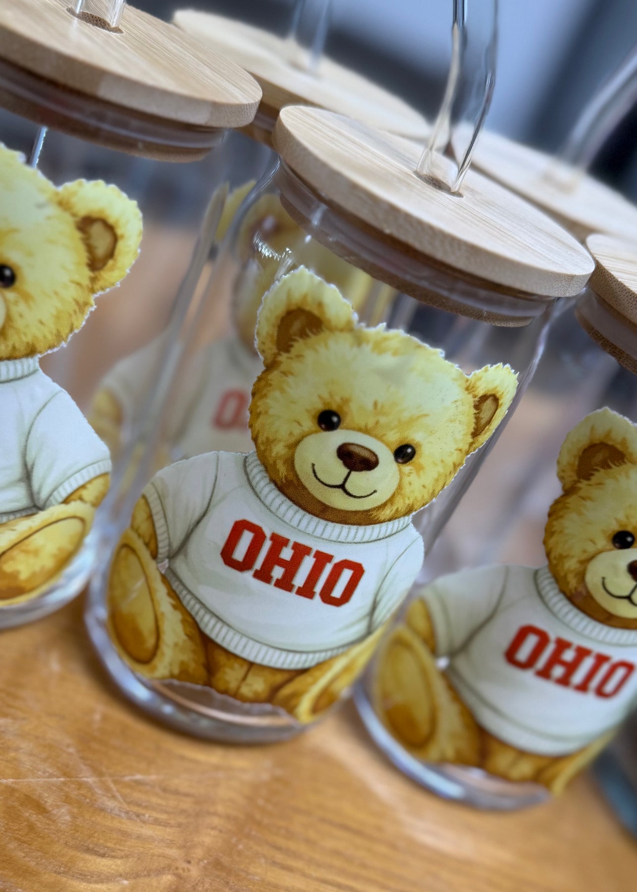 Glass Cup with Glass Straw available in multiple different designs.