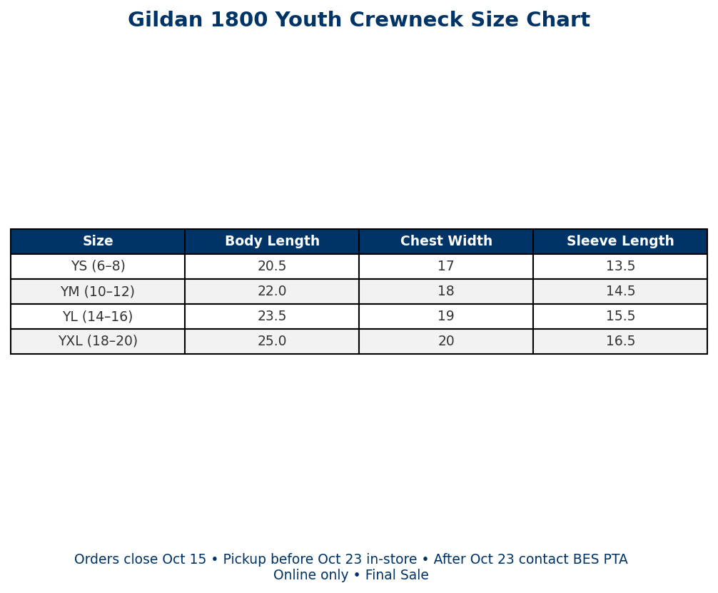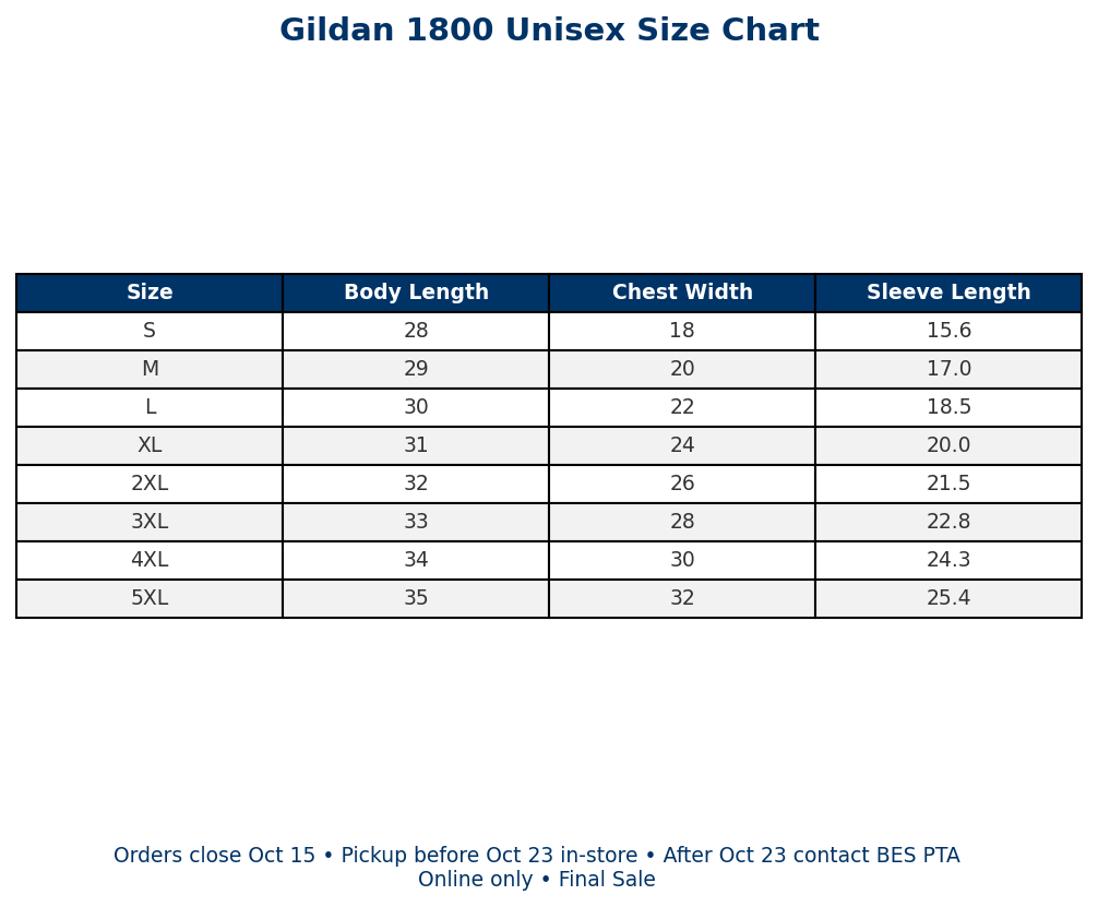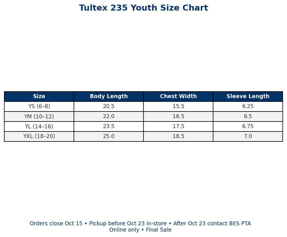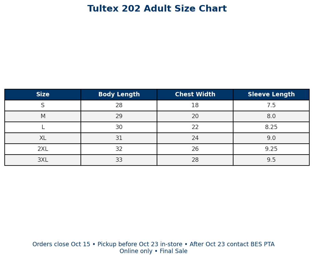 Have a question? Please reach out to BES PTA before ordering.Â