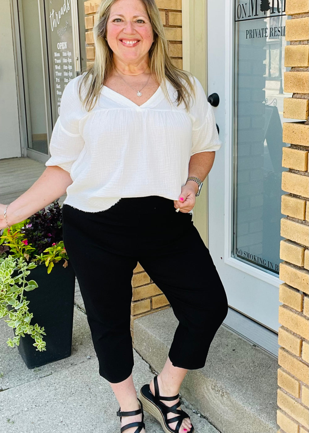 Experience ultimate comfort designed with just the right amount of stretch for all-day wear. Versatile and stylish, they effortlessly transition from casual to chic—pair with a simple tee or tank for relaxed days, or elevate your look with a cardigan or crochet top and wedge sandals for brunch or evening outings. These capris are set to become your favorite wardrobe staple.